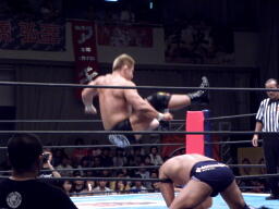 永田対角線コーナーに振ってつっこむ、高橋かわしてジャーマン(右写真)、カウント2。