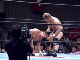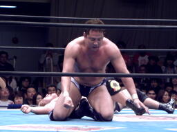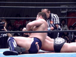 再度ロックアップ、永田ロープに詰める、高橋体勢入れ替えてサミング(左写真)。