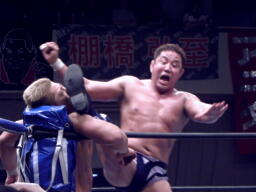 高橋張り手(左写真)、永田すぐに延髄蹴り。コーナーに下がった高橋にタイナー。