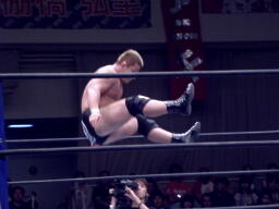 コーナーに上ってダイビングギロチンドロップ(左写真)、カウント2。