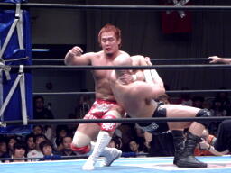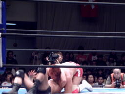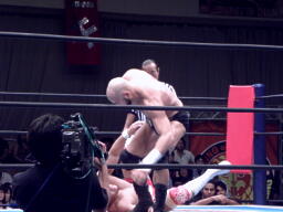 ニードロップ(右写真)、カウント2。アンダーソンロープに振る、内藤ロープをつかんで戻らない、アンダーソン突っ込む、内藤がリープフロッグでかわすとアンダーソンは場外転落。