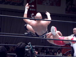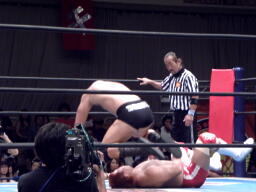 ロープでチョーク、首投げからエルボードロップ、サマーソルトドロップ(左写真)、カウント2。5分経過。