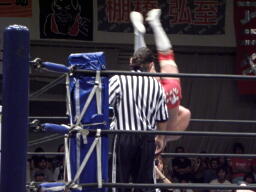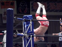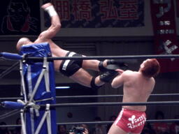 アンダーソンチョップ、内藤パンチ、アンダーソンチョップでダウンさせコーナーに上るとミサイルキック(右写真)。