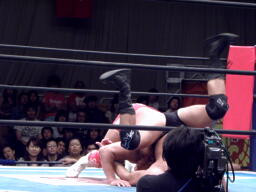 内藤コーナーに上ってスターダストプレス(左写真)、カウント3。