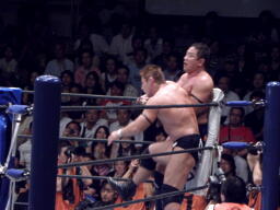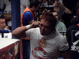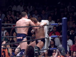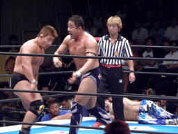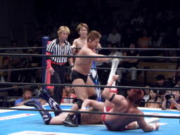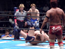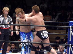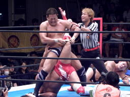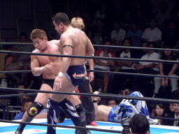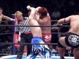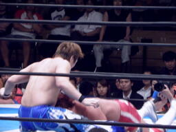 井上強引に脱がす(右写真)。内藤足をすくってレッグロック、井上十字に切り返す、内藤ロープ。井上首投げからスリーパー、内藤切り返してアームロック、裕二郎にタッチ。