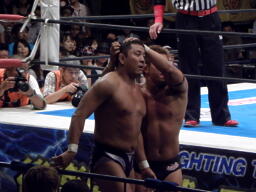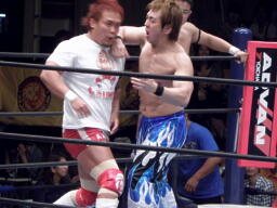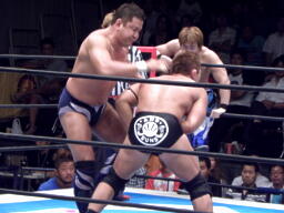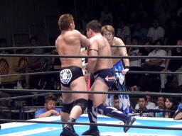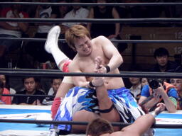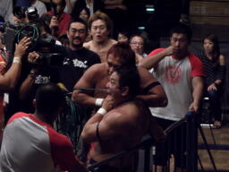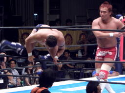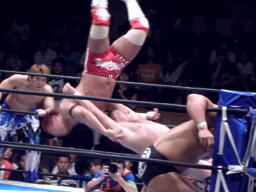 内藤に逆片エビ(左写真)、裕二郎がカット。井上が内藤を場外に出す。
