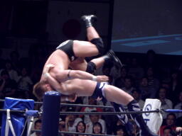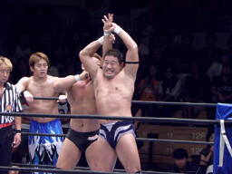 井上が裕二郎にスピアー、続いて永田がバックドロップホールド(右写真)、カウント3。