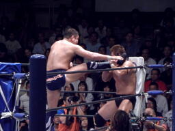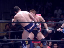 井上と内藤エルボーの打ち合い(左写真)。10分経過。