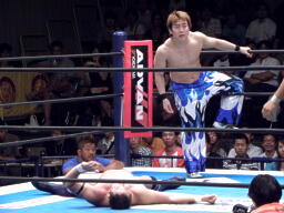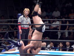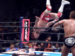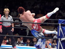 リングに戻すとサマーソルトドロップ(左写真)、カウント2。裕二郎にタッチ。