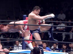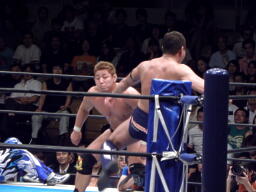 内藤ロープに飛ぶが永田はローキックで内藤の足を払う(右写真)。