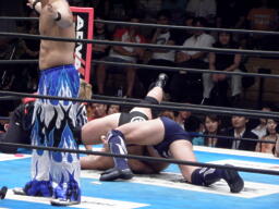 そこに内藤がドロップキック(左写真)、カバーは井上がカット。裕二郎は内藤を呼び込む。