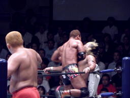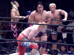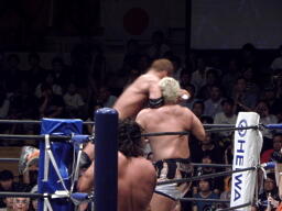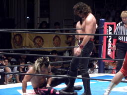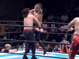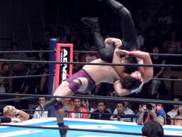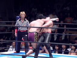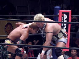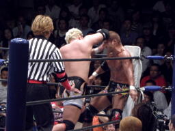 ロックアップ、棚橋ロープに押し込む、ブレーク。再度ロックアップ、矢野は棚橋の髪を引っ張る(右写真)。矢野ガットショット、ロープに振ってラリアット、棚橋かわしてショルダーブロック。棚橋ロープに振ってドロップキック、矢野スカす。矢野ロープに飛ぶ、棚橋起き上がってドロップキック、後藤にタッチ。