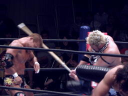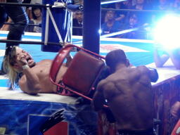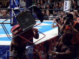 棚橋のヒザを鉄柱に引っ掛けて田中がイスで一撃(右写真)。矢野リングに戻す。中邑逆片エビ、棚橋ロープ。中邑は田中にタッチ。