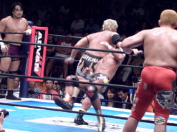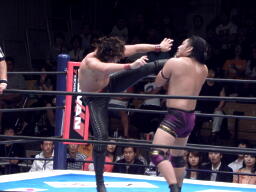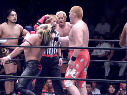真壁と田中ラリアット相打ち繰り返す(左写真)、真壁打ち勝って後藤にタッチ。田中も中邑にタッチ。