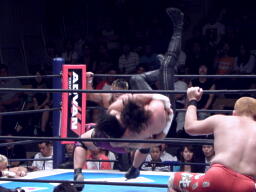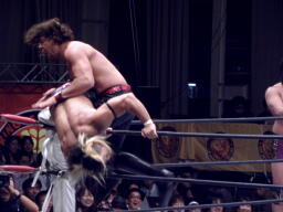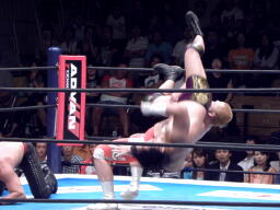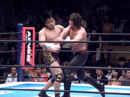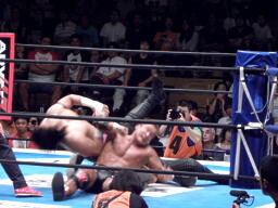 手四つから首の取り合い、バックの取り合い。中邑タックル、後藤切って上になる(左写真)、中邑切り返しブレーク。後藤は棚橋にタッチ。5分経過。