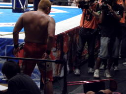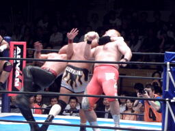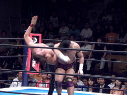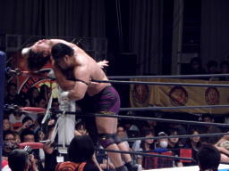 真壁ナックル(右写真)、場外に出してボディスラム。