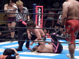 中邑ボディスラム、棚橋のノドにヒザを押しつける(右写真)。田中にタッチ。10分経過。