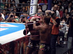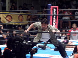 田中がスライディングDでカット(右写真)。真壁が田中を場外に出す。