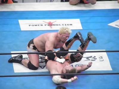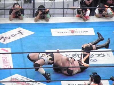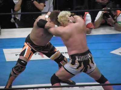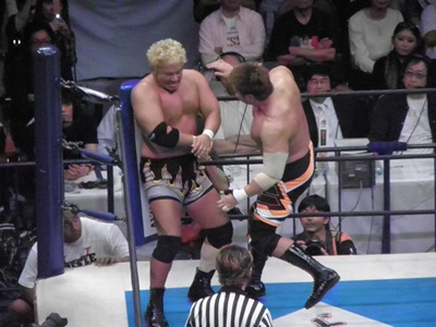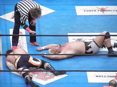 小島ラリアット、真壁ブロック(左写真)、小島は左でラリアット、カウント2。