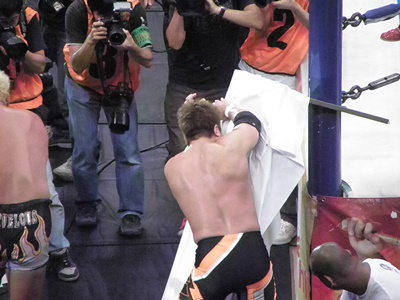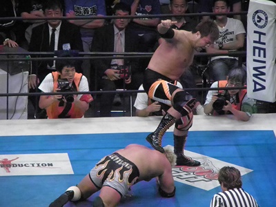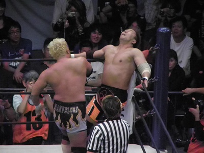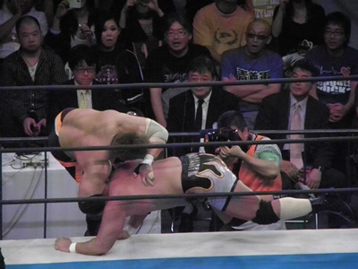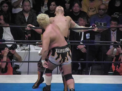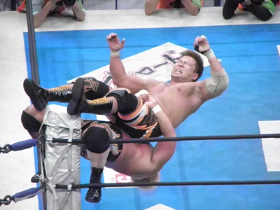 真壁ラリアット(右写真)、ロープに飛ぶ。