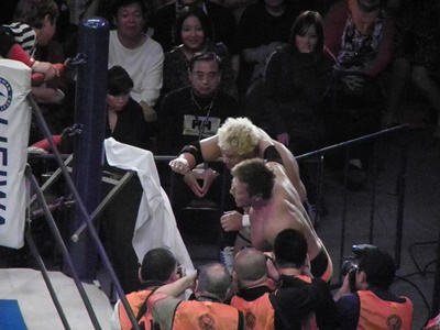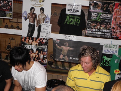 押し寄せる客に井上マイクと共に対応するゴールデン☆ラヴァーズ(右写真)。サイン、写真、握手に気軽に応じる。どう見てもDDTファンだけではない人の多さだからこの2人は新日本ファンにも受け入れられたのかもしれない。