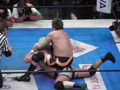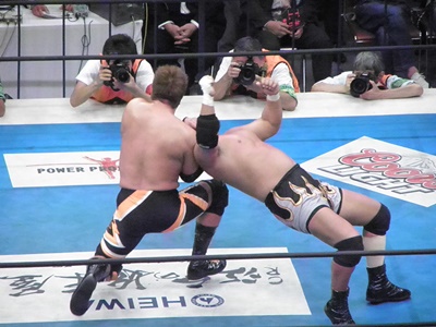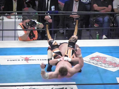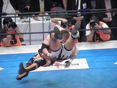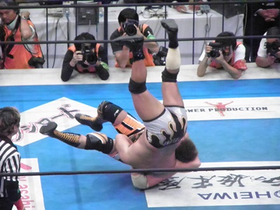 真壁フロントスープレックス(左写真)、カウント2。