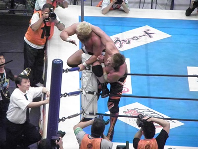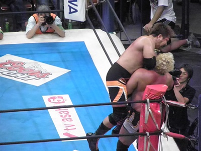 真壁デスバレーボム(右写真)、コーナーに上る。