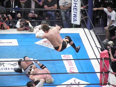 「行っちゃうぞバカヤロー」は言わずにダイビングエルボードロップ(右写真)、カウント2。