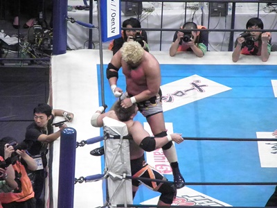 小島DDT、変形のネックブリーカー(右写真)、コーナーに上げて雪崩式DDT。真壁は首を痛めているという情報でもあったのだろうか、小島が最初っから首狙いだな。