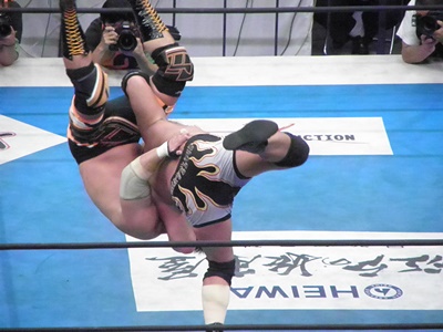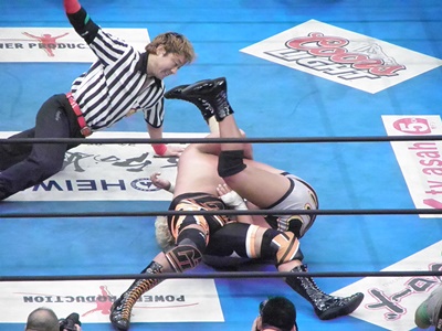 小島のラリアットかわし真壁ジャーマン(左写真)、カウント2。