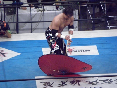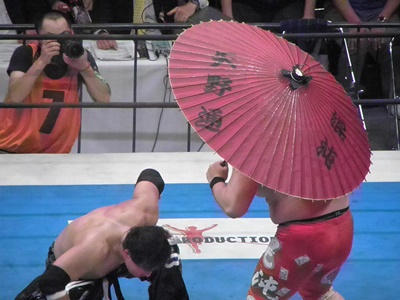 矢野急所打ち(右写真)。矢野はもう一本の番傘を出してくる。