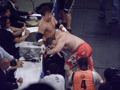矢野リングに戻す、TAJIRIリング上を転がってまたすぐに場外に出る(右写真)。