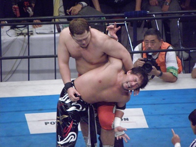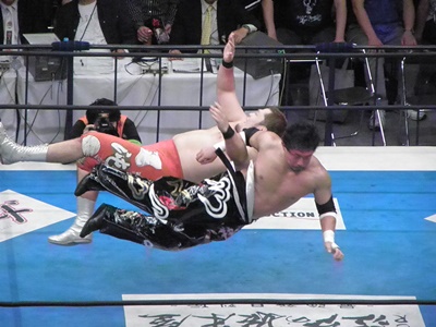 矢野鬼ころしに、TAJIRIフランケンシュタイナーに切り返す(右写真)。