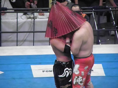 神戸と同様に番傘でミストをブロックしようとする矢野、TAJIRIもそれを読んでフェイント(左写真)。