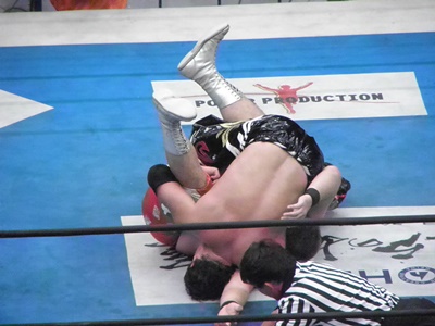 首固め(右写真)、カウント2。TAJIRIスクールボーイ、矢野はレフェリーを引き込む。