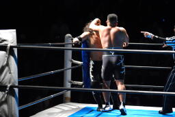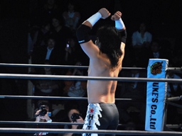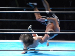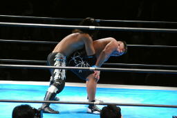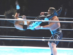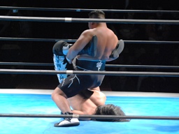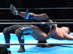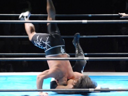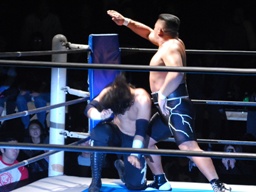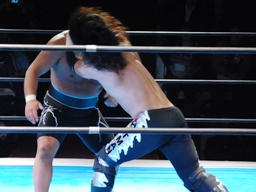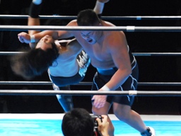 石井ブレーンバスター、佐々木着地、石井ロープに振る、佐々木切り返してウラカンホイップ(右写真)。