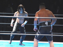 試合開始。新旧DDT実力派フリー選手対決の感(左写真)。
