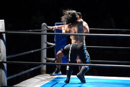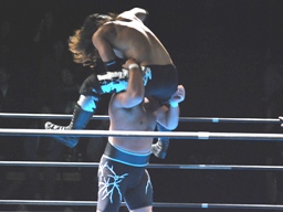 石井コーナーに振って突っ込む、佐々木カウンターのキック(左写真)。コーナーに上ってミサイルキック、石井スカす。
