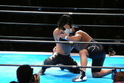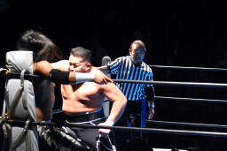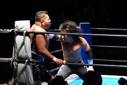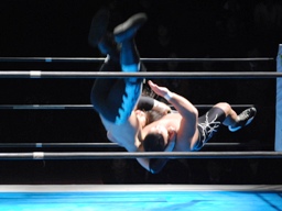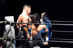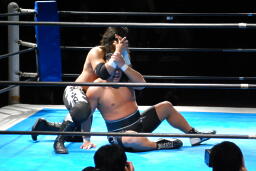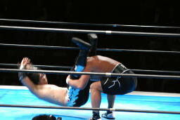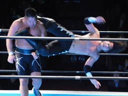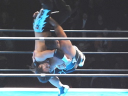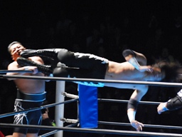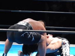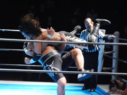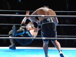 佐々木エルボー、ロープに飛んでウラカン・ラナ、石井はパワーボムに切り返す(右写真)、カウント2。