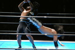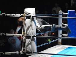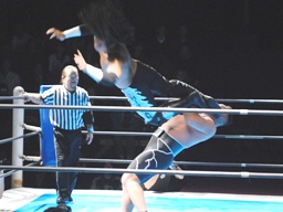 再度コーナーに上ってミサイルキック(右写真)、カウント2。