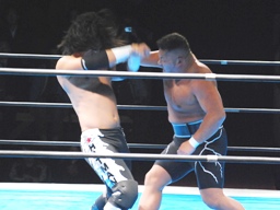 石井パワーボム狙う、佐々木ブロックしてパンチ連打(左写真)。