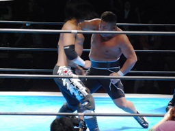 佐々木ヘッドロック(右写真)、石井ロープに振ってショルダーブロック。