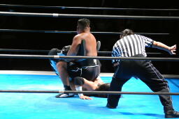がっちり腰を落とす(左写真)、佐々木なんとかロープエスケープ。