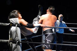 石井ロープに振ってラリアット、佐々木かわして延髄蹴り(右写真)。