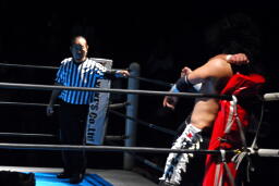 トペ・スイシーダ(左写真)。リングに戻してカバー、カウントは1。