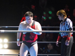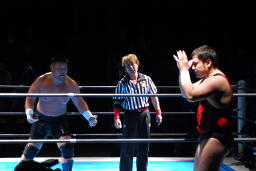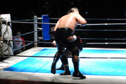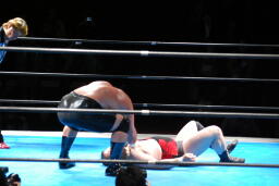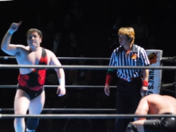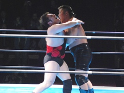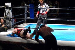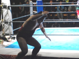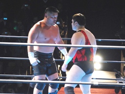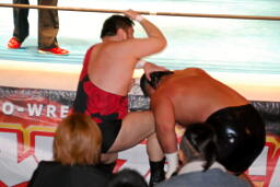 アントンDDTに行くが天山はロープをつかんでこらえる(左写真)、アントン自爆。