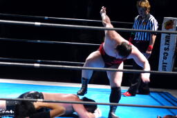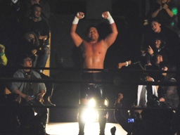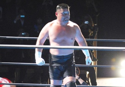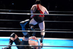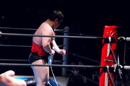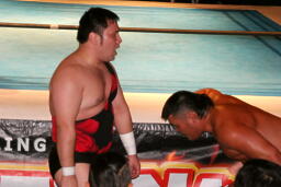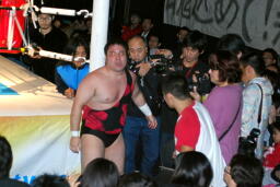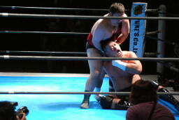 エプロンに上った天山のボディにショルダータックル(右写真)。