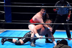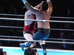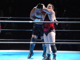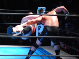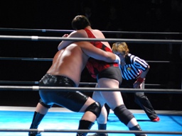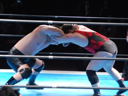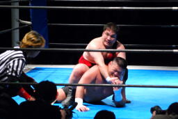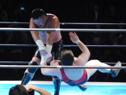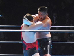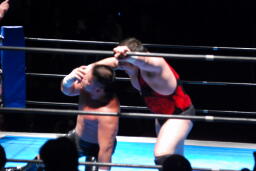 天山ガットショットからヘッドロック、アントンロープに振る、天山ショルダーブロック(右写真)。