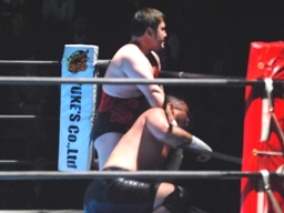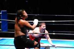 首筋にチョップ落とす(右写真)、アントンは場外エスケープ。