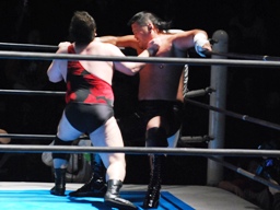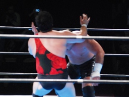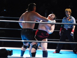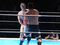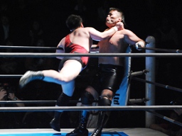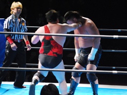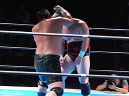 天山チョップ(右写真)、アントンもパンチで応戦。